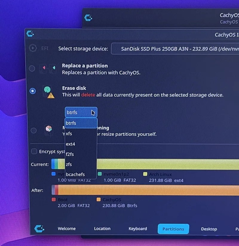 CachyOS offers a wide range of filesystems out of the box, including ZFS. For the root partition, I usually go with EXT4 it's fast and efficient. As for the second partition, I'll format it to host a ZFS pool.