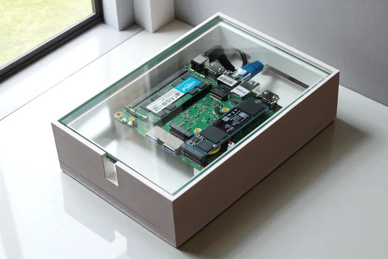 Incus box in a 3D-printed case with a thick 8mm glass panel on top